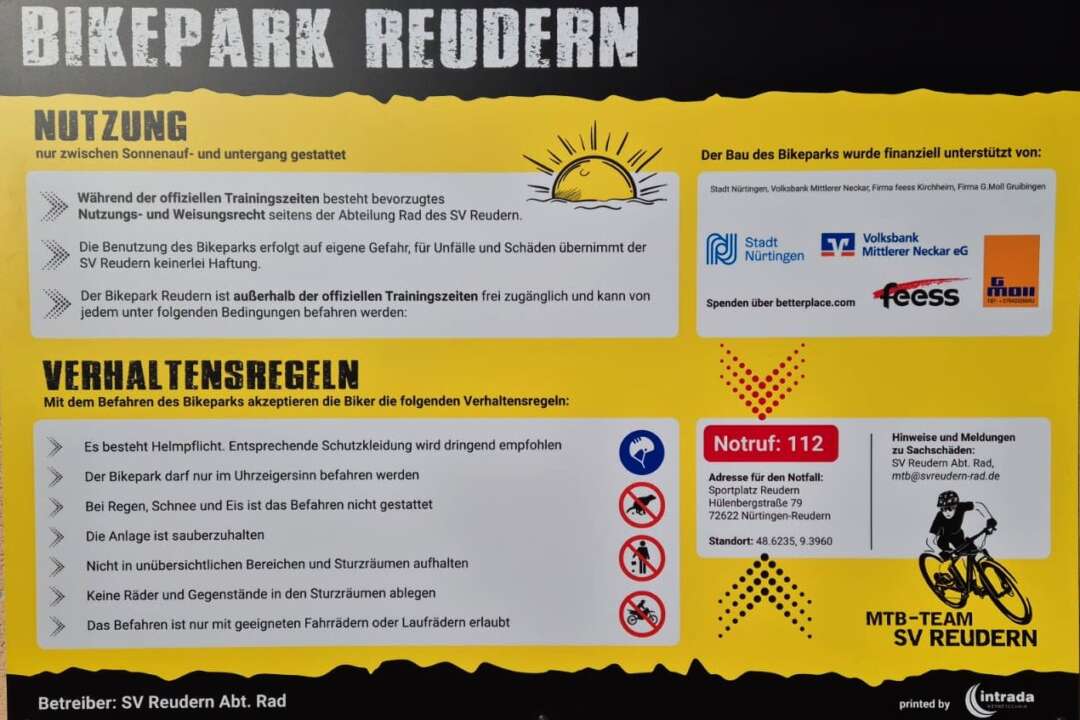 Seit kurzem hängt an unserem Gerätehaus eine neue Hinweistafel mit wichtigen Infos und Hinweisen zu unserem Bikegelände. Wann darf man den Bikepark befahren? Ist der Bikepark öffentlich zugängig? Was geschieht im Notfall? Welche Adresse hat der Bikepark für eventuelle Notfälle? Alles Fragen, zu denen man auf der neuen großen Infotafel Antworten findet. Damit weiterlesen…